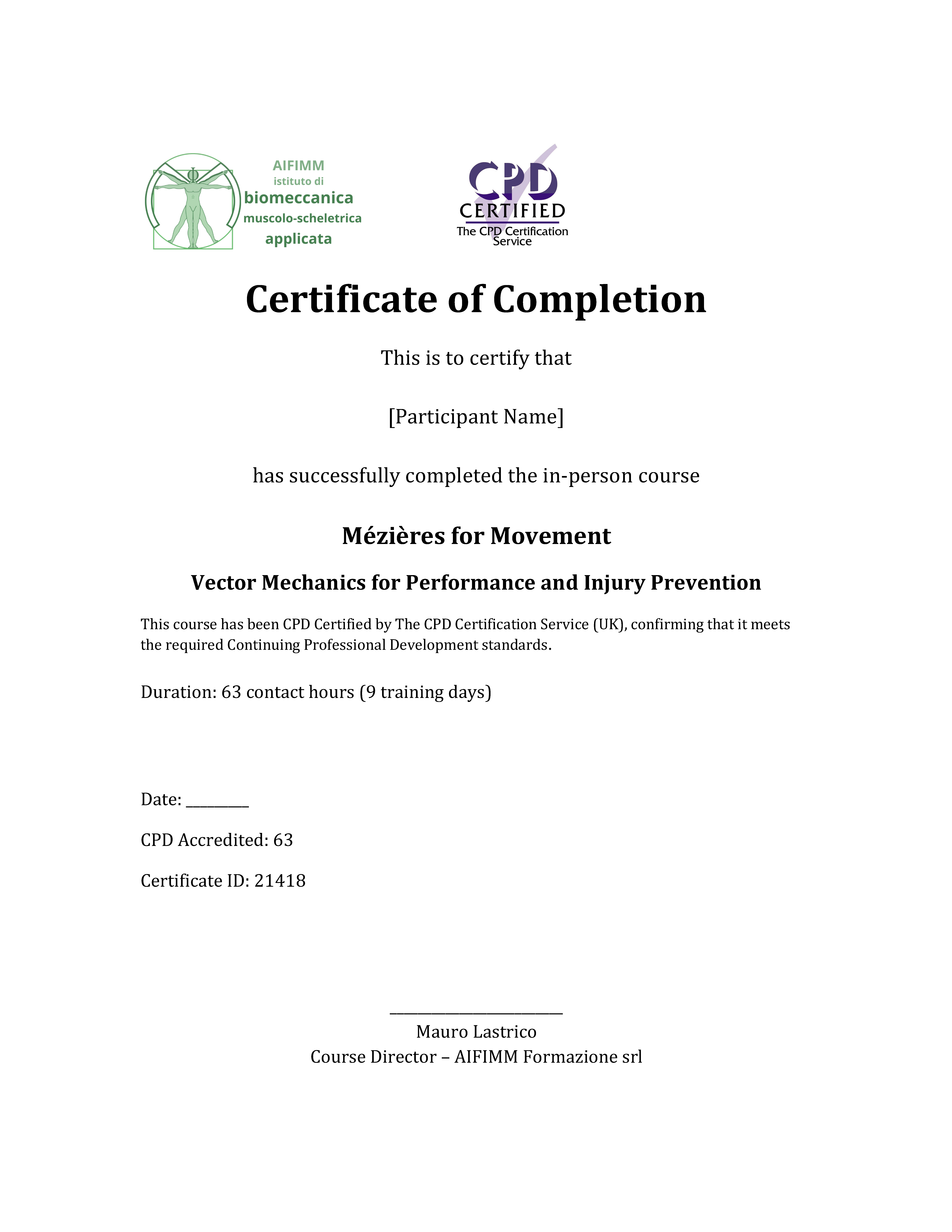 Il corso rilascia crediti formativi? Sì, 63 crediti CPD internazionali (CPD Certification Service UK, Provider n. 21418). La certificazione è stata ottenuta dopo valutazione indipendente dei contenuti da parte di una commissione tecnico-scientifica esterna. Il corso non rilascia crediti ECM in quanto destinato a professionisti del movimento, non a professionisti sanitari.